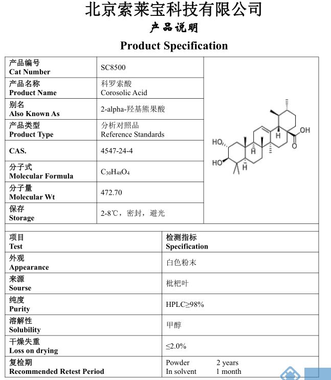 产品名称: Corosolic Acid;科罗索酸